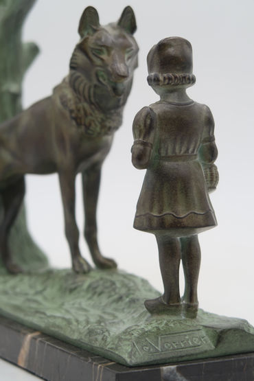 It was in response to his wife Jeanne's interest in La Fontaine's fables that Max Le Verrier created this work, just like the book-ends "The raven and the fox" or "The cobbler and the financier". His model for the Little Red Riding Hood face was his niece Annie, creating by the same time the model CANDEUR.